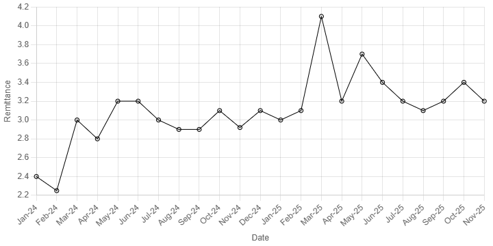 اسٹیٹ بینک آف پاکستان کے جاری کردہ اعداد و شمار کے مطابق، بیرونِ ملک مقیم پاکستانیوں نے نومبر 2025 میں 3.2 ارب ڈالر وطن بھیجے۔ گزشتہ سال نومبر کے مقابلے میں ترسیلات زر میں 9.4 فیصد اضافہ ریکارڈ کیا گیا، البتہ اکتوبر 2025 کے 3.4 ارب ڈالر کے مقابلے میں ماہانہ بنیادوں پر 7 فیصد کمی ہوئی۔