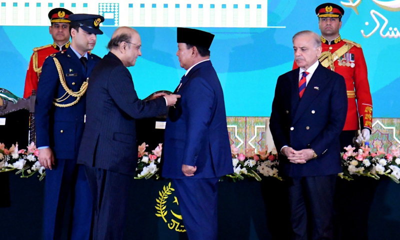 اسلام آباد میں ایوانِ صدر میں منعقدہ خصوصی تقریب میں صدرِ پاکستان آصف علی زرداری نے دورہ پاکستان پر آئے ہوئے انڈونیشیا کے صدر پرابوو سوبیانتو کو ملک کا اعلیٰ ترین سول اعزاز نشانِ پاکستان پیش کیا۔