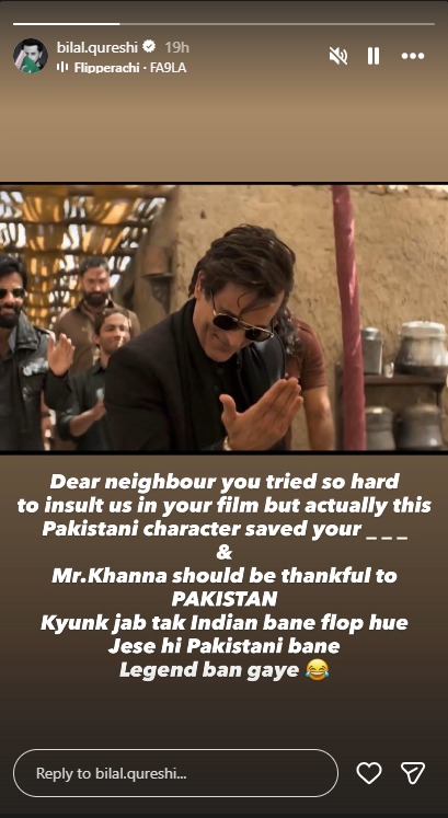 انہوں نے مزید کہا کہ اکشے کھنہ کو پاکستان کا شکر گزار ہونا چاہیے کیونکہ ان کے مطابق جب تک وہ انڈین کردار کرتے رہے فلمیں فلاپ ہوئیں اور جیسے ہی پاکستانی کردار نبھایا وہ لیجنڈ بن گئے۔