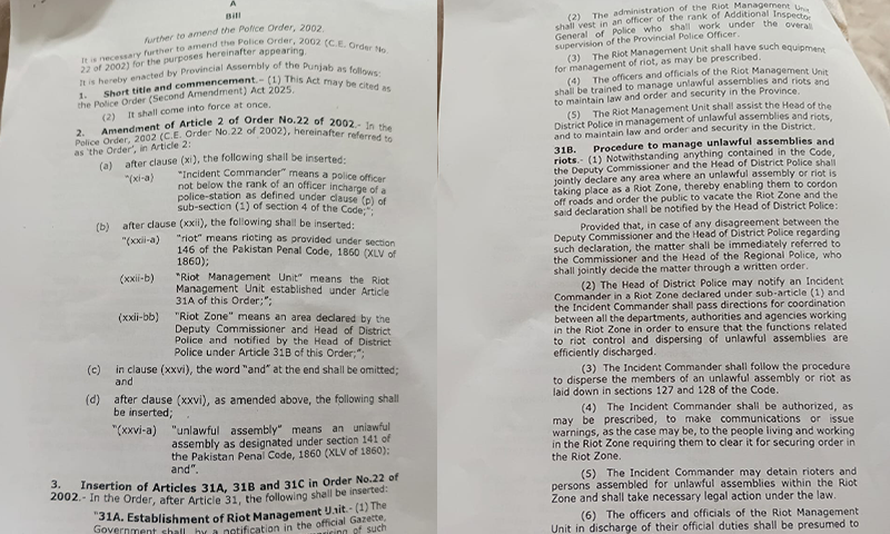 اس سلسلے میں پولیس آرڈرایکٹ 2025 سے متعلق دوسری ترمیم سے پنجاب اسمبلی میں پیش کر دیا گیا ہے، جس کے تحت نہ صرف پرتشدد احتجاجیوں کو سزائیں دی جائیں گی بلکہ ان سے سرکاری و نجی املاک کو پہنچنے والے نقصان کا ازالہ بھی وصول کیا جائے گا۔