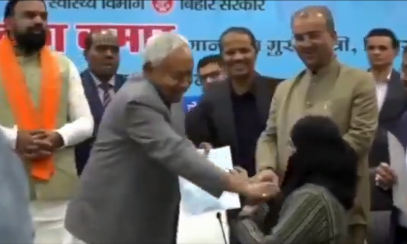 بھارتی ریاست بہار کے دارالحکومت پٹنہ میں ایک سرکاری تقریب کے دوران وزیر اعلیٰ نتیش کمار کی جانب سے ایک مسلم خاتون ڈاکٹر کا نقاب کھینچنے کے واقعے کی ویڈیو سوشل میڈیا پر وائرل ہو گئی ہے، جس نے عوام، مسلم رہنماؤں اور اپوزیشن جماعتوں میں غم و غصے کی لہر دوڑا دی ہے۔