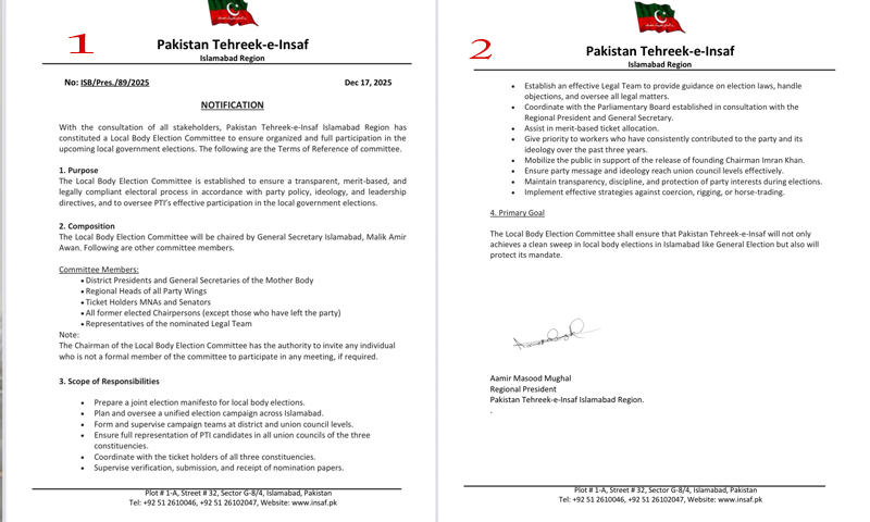 نوٹیفکیشن میں کہا گیا ہے کہ ریجنل صدر اور جنرل سیکریٹری کی مشاورت سے قائم کردہ ریجنل پارلیمانی بورڈ کے ساتھ رابطے، میرٹ کی بنیاد پر ٹکٹوں کی تقسیم میں معاونت، پارٹی کارکنان کو ترجیحی بنیاد پر میدان میں اتارنا، بانی چیئرمین عمران خان کی رہائی کے لیے عوامی سطح پر رابطہ مہم اور پارٹی پیغام کو یونین کونسل سطح تک پہنچانا کمیٹی کے دیگر اہم امور میں شامل ہیں۔