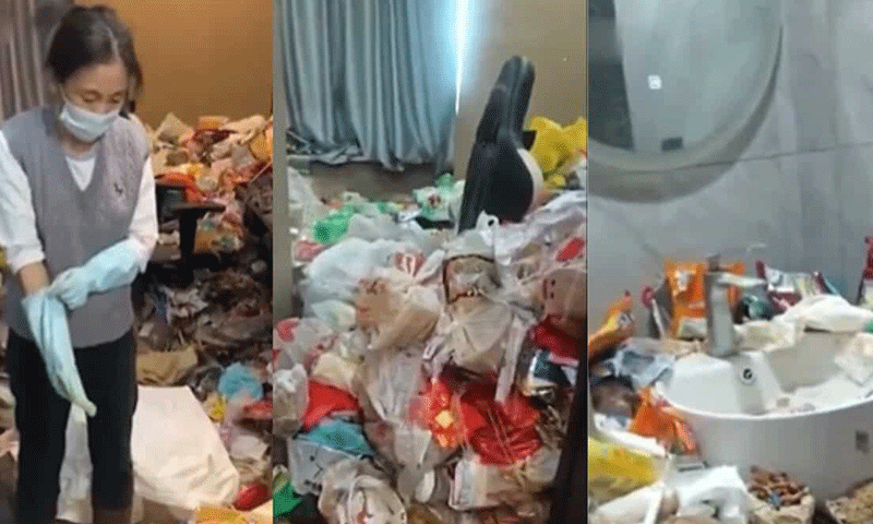 کمرے میں پھینکے گئے سینکڑوں فوڈ پیکٹس، خالی بوتلیں، کھانے کے ڈبے، پلاسٹک بیگز، ٹشو رولز، گندے کپ اور فاسٹ فوڈ پیکنگ وغیرہ مل کر تقریباً ایک میٹر اونچا پہاڑ بن چکی تھیں۔