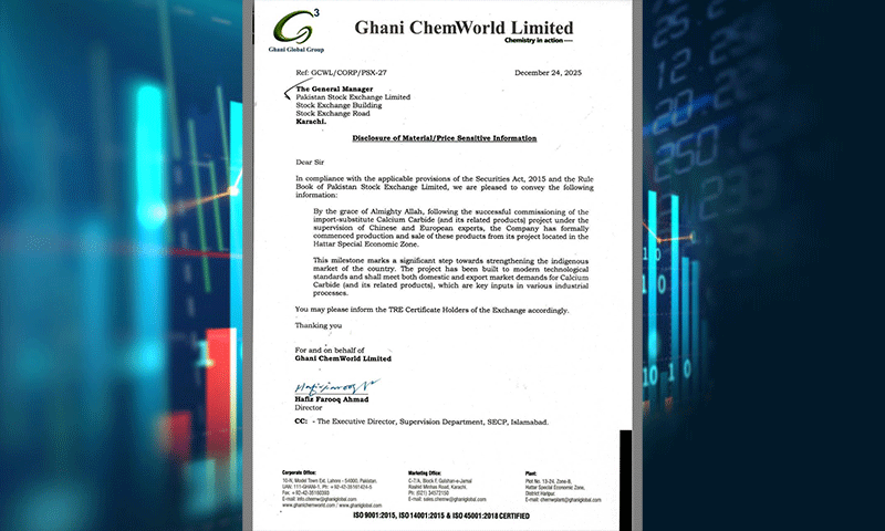 غنی کیم ورلڈ لمیٹڈ نے پاکستان اسٹاک ایکسچینج کو ارسال کردہ خط میں بتایا ہے کہ ہری پور میں واقع حطار اسپیشل اکنامک زون میں قائم منصوبے کے تحت میڈ اِن پاکستان کیلشیئم کاربائیڈ کی تیاری کا کامیاب آغاز کر دیا گیا ہے۔