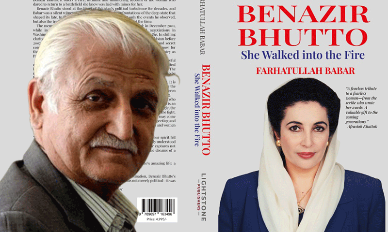 شہید محترمہ بینظیر بھٹو کی 18ویں برسی کے موقع پر لائٹ اسٹون پبلشرز کراچی نے ان کے سابق ترجمان اور سابق سینیٹر فرحت اللہ بابر کی یاد داشتوں پر مبنی کتاب ’ She Walked into the Fire ‘ شائع کرنے کا اعلان کر دیا، جس میں بینظیر بھٹو کی سیاسی جدوجہد، جمہوری سوچ اور پس پردہ سفارتی کوششوں کو تفصیل سے بیان کیا گیا ہے۔