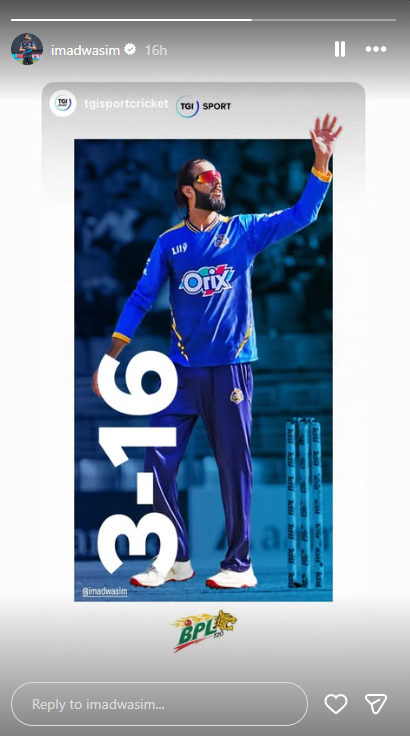عماد وسیم نے اپنی اہلیہ سے طلاق کے اعلان کے بعد انسٹاگرام پر پہلی پوسٹ میں بی پی ایل میں اپنی عمدہ بولنگ کارکردگی کی اسٹوری شیئر کی جس میں انہوں نے چار اوورز میں صرف 16 رنز دے کر 3 اہم وکٹیں حاصل کیں۔