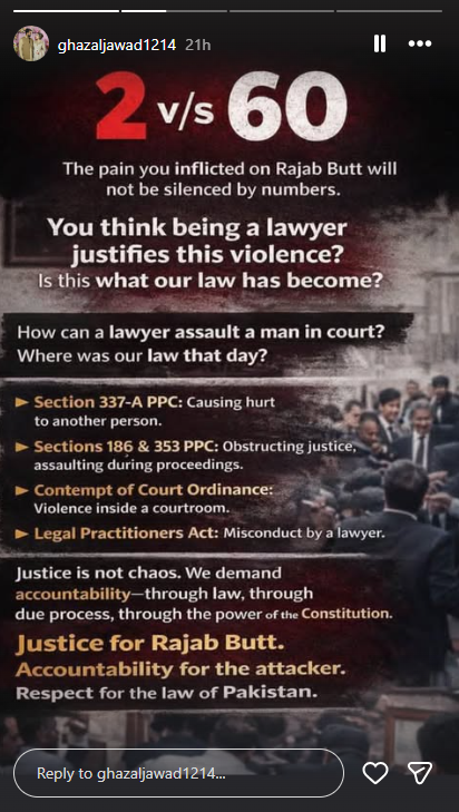 غزل جواد نے کہا کہ ایک وکیل کس طرح عدالت میں کسی آدمی پر حملہ کر سکتا ہے؟ کیا آپ کو لگتا ہے کہ وکیل ہونا اس تشدد کو جائز بناتا ہے؟ کیا یہی ہمارا قانون بن گیا ہے؟ انہوں نے سوال کیا کہ اس دن ہمارا قانون کہاں تھا؟