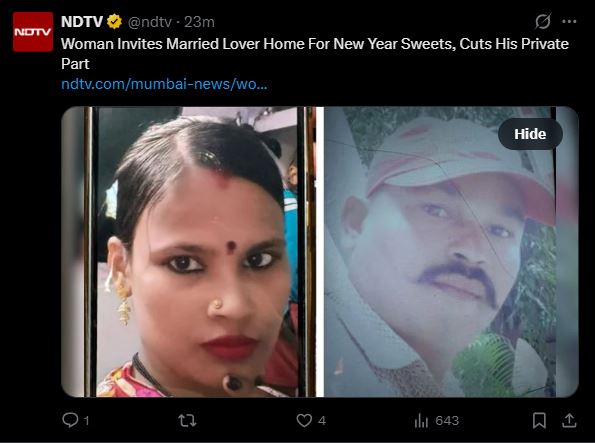 A shocking incident has come to light from Mumbai, where a woman allegedly attacked her lover and severed his private parts after he refused to marry her.@dipeshtripathi0 #Mumbai https://t.co/i2HPhghAOR