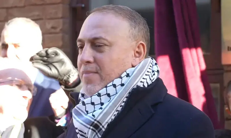 روایتی سیاہ و سفید فلسطینی اسکارف پہنے ہوئے فلسطینی سفیر حسام زملط نے کہا کہ یہ محض نام کی تبدیلی نہیں بلکہ فلسطینی ریاست کے قیام کی سمت ایک واضح پیشرفت ہے۔