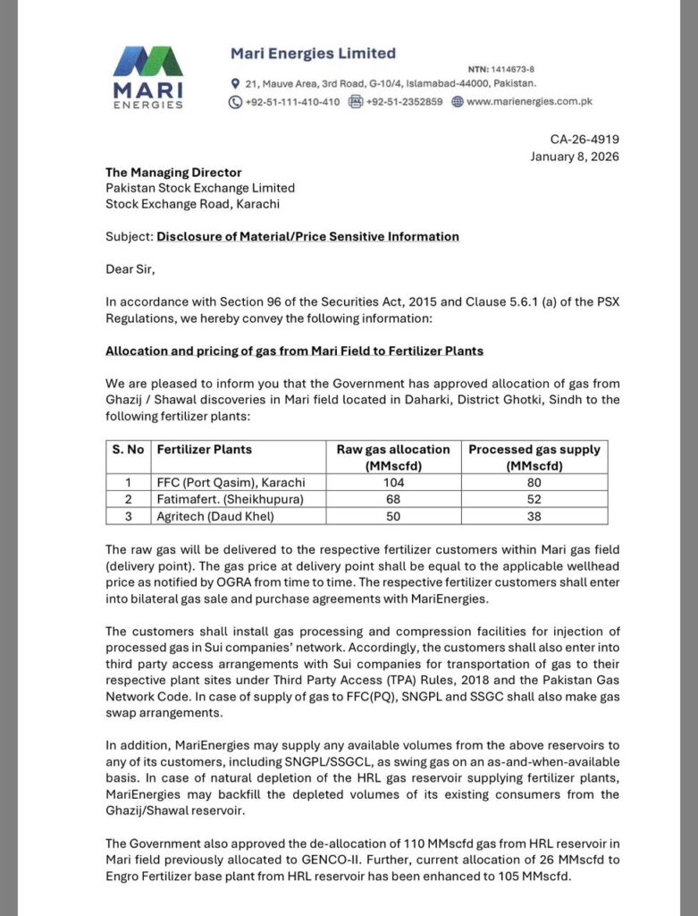 ماری انرجیز لمیٹڈ نے گیس کی الاٹمنٹ اور قیمتوں کی تفصیلات کے حوالے سے پاکستان اسٹاک ایکسچینج (پی ایس ایکس) کو باضابطہ خط ارسال کر دیا ہے۔