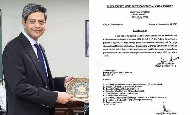 وزیراعظم نے ڈاکٹر کبیر احمد سدھو کو سیکیورٹیز اینڈ ایکسچینج کمیشن آف پاکستان (ایس ای سی پی) کا نیا چیئرمین تعینات کر دیا ہے، جس کا باضابطہ نوٹیفکیشن بھی جاری کر دیا گیا۔ ڈاکٹر کبیر سدھو اس سے قبل چیئرمین کمپٹیشن کمیشن آف پاکستان کے طور پر خدمات انجام دے رہے تھے۔