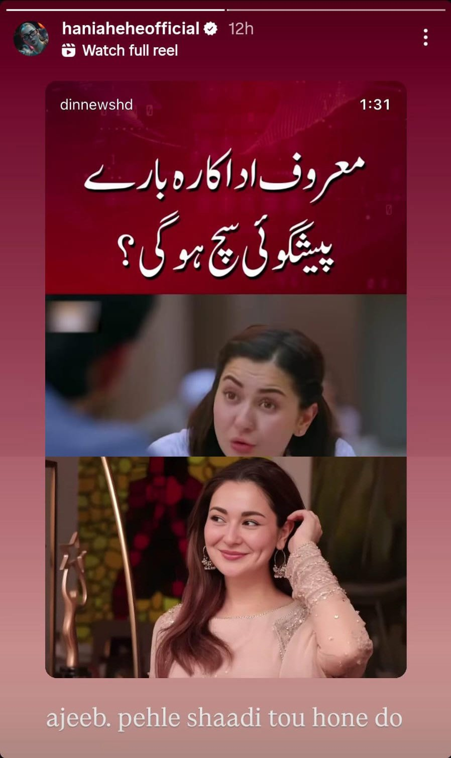 حالیہ دنوں میں ہانیہ نے اپنے انسٹاگرام اکاؤنٹ پر ایک مقامی ٹی وی چینل کی ویڈیو شیئر کی، جس میں ایک نجومی ان کی ذاتی زندگی کے بارے میں پیشگوئی کررہا تھا۔