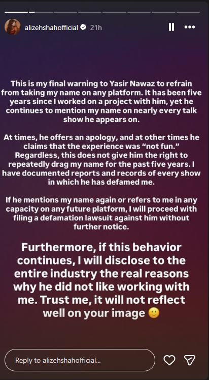 اس کے ساتھ ہی اداکارہ نے واضح کیا کہ اگر یاسر نواز مستقبل میں کسی بھی پلیٹ فارم پر دوبارہ ان کا نام لیں تو بلا تاخیر بدنامی کا قانونی اقدام اٹھایا جائے گا۔ مزید یہ کہ اگر یہ رویہ جاری رہا تو اصل وجوہات بھی سامنے لاؤں گی کہ وہ میرے ساتھ کام کیوں نہیں کرنا چاہتے، جو یاسر نواز کی ساکھ پر منفی اثر ڈال سکتی ہیں۔