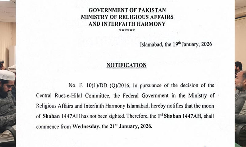 چیئرمین مرکزی رویت ہلال کمیٹی پاکستان مولانا سید محمد عبدالخبیر آزاد کے اعلان کے مطابق پاکستان میں آج شعبان کا چاند نظر نہیں آیا۔ یکم شعبان المعظم 1447 ہجری بدھ 21 جنوری 2026 کو ہوگا۔ وزارت مذہبی امور نے نوٹیفکیشن جاری کردیا۔