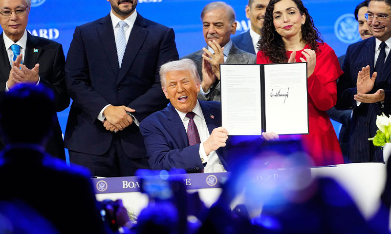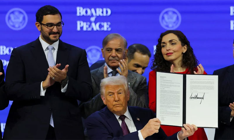 ورلڈ اکنامک فورم 2026 کے موقع پر فلسطین میں پائیدار امن کے قیام کے لیے قائم کیے گئے بورڈ آف پیس پر دستخط کی تقریب منعقد ہوئی، جس میں پاکستان نے امریکی صدر ڈونلڈ ٹرمپ کی دعوت پر شمولیت اختیار کی۔ اس اقدام کا مقصد غزہ میں مستقل جنگ بندی، انسانی بحران کا خاتمہ اور اقوام متحدہ کی سلامتی کونسل کی قراردادوں کے مطابق فلسطین کی منظم، جامع اور پائیدار تعمیرِ نو ہے۔