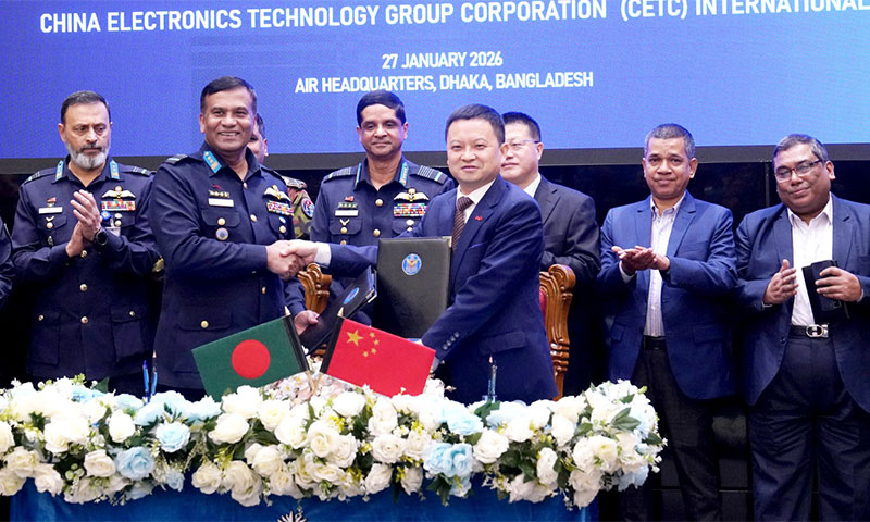 منگل کو بنگلہ دیش ایئر فورس (BAF) اور چین الیکٹرانکس ٹیکنالوجی گروپ کارپوریشن (CETC) انٹرنیشنل کے درمیان حکومت سے حکومت (G2G) کی سطح پر ایک معاہدہ طے پایا، جس کے تحت بنگلہ دیش میں بغیر پائلٹ طیاروں (UAVs) کی پیداوار اور اسمبلی کے لیے پلانٹ قائم کیا جائے گا اور ٹیکنالوجی ٹرانسفر کا جامع انتظام ہوگا۔