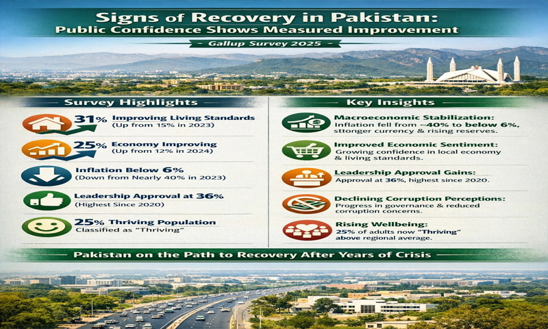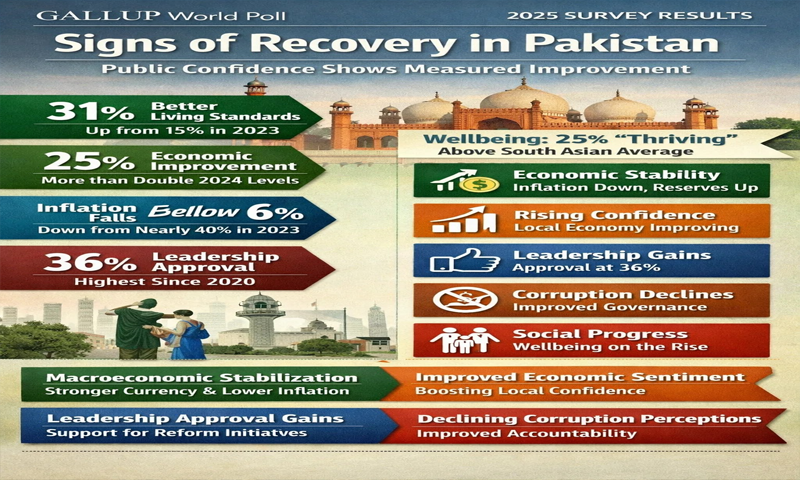 گیلپ ورلڈ پول کے سال 2025 کے سروے کے مطابق پاکستان میں طویل سیاسی اور معاشی بحران کے بعد عوامی رجحانات میں نمایاں بہتری کے آثار سامنے آئے ہیں۔