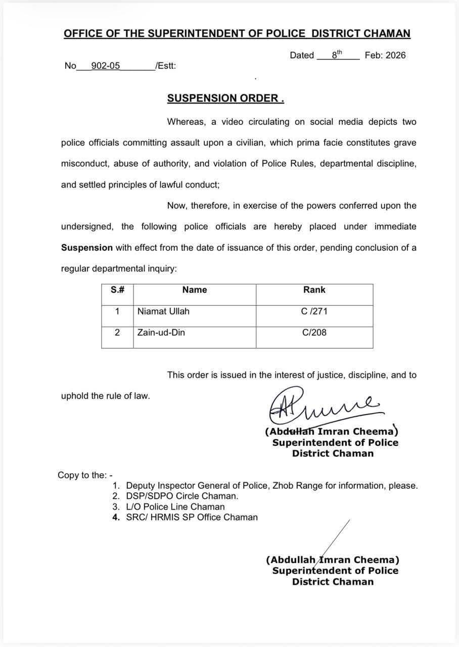 واقعہ گزشتہ روز چمن میں پیش آیا تھا، تشدد میں ملوث 2 پولیس اہلکار نعمت اللہ اور زین الدین کو معطل کردیا گیا ہے۔