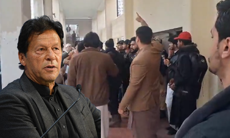 اس دوران اسلامک اسٹوڈنٹس فیڈریشن (آئی ایس ایف) کے کارکنان ہال کے باہر جمع ہو گئے اور سابق وزیرِاعظم و بانی پی ٹی آئی عمران خان کے حق میں نعرے بازی کی۔ مظاہرین کی جانب سے ’نعرۂ عمران‘ اور ’جیوے جیوے عمران‘ کے نعرے لگائے گئے جن کی گونج ہال کے اندر تک سنائی دیتی رہی۔