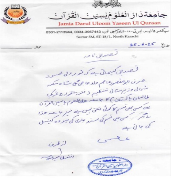 انتظامیہ کی جانب سے جاری ایک بیان میں کہا گیا ہے، ’تصدیق کی جاتی ہے کہ نور ولی محسود عرف ابو منصور عاصم ولد حاجی گل شاہ سکنہ شمالی وزیرستان (تنظیم فتنہ الخوارج تحریک طالبان پاکستان) کا جامعہ دارالعلوم یاسین القرآن سے کسی قسم کا کوئی تعلق نہیں۔‘