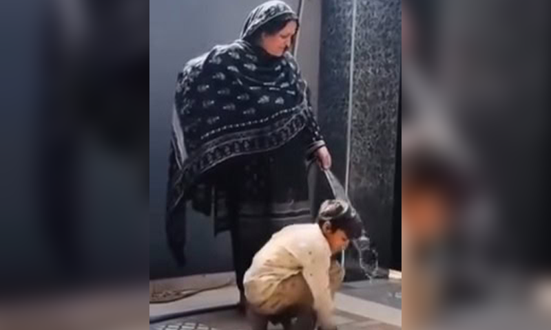 ویڈیو میں رجب بٹ کی والدہ کو بچے کے ساتھ دکھایا گیا ہے جو گھر کی صفائی کررہا ہے۔