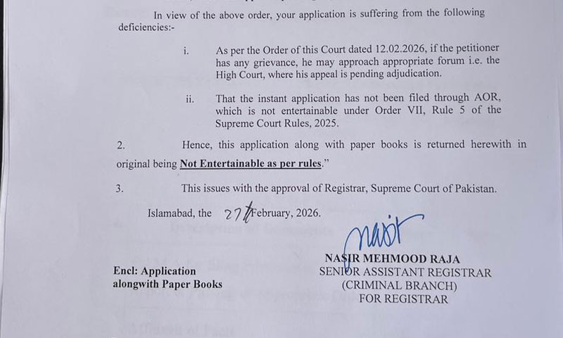 رجسٹرار آفس کے مطابق عدالتی فیصلے میں واضح کیا گیا ہے کہ دادرسی کے لیے متعلقہ ہائیکورٹ سے رجوع کیا جائے، اور یہ کہ درخواست ایڈووکیٹ آن ریکارڈ کے ذریعے دائر نہیں کی گئی۔