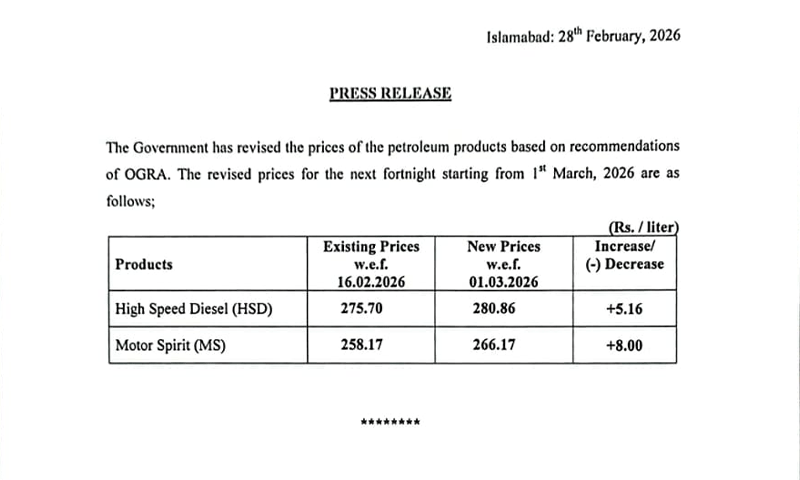 اس سے قبل 15 فروری کو پیٹرول کی قیمت میں 5 روپے جبکہ ہائی اسپیڈ ڈیزل کی قیمت میں 7 روپے 32 پیسے کا اضافہ کیا گیا تھا۔