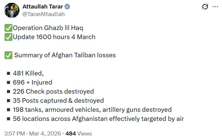 پاکستان کا افغان طالبان رجیم کے خلاف شروع کیا گیا آپریشن غضب للحق جاری ہے، اور اب تک مختلف کارروائیوں میں 481 افغان طالبان ہلاک ہو چکے ہیں، جبکہ 696 سے زیادہ زخمی ہیں۔