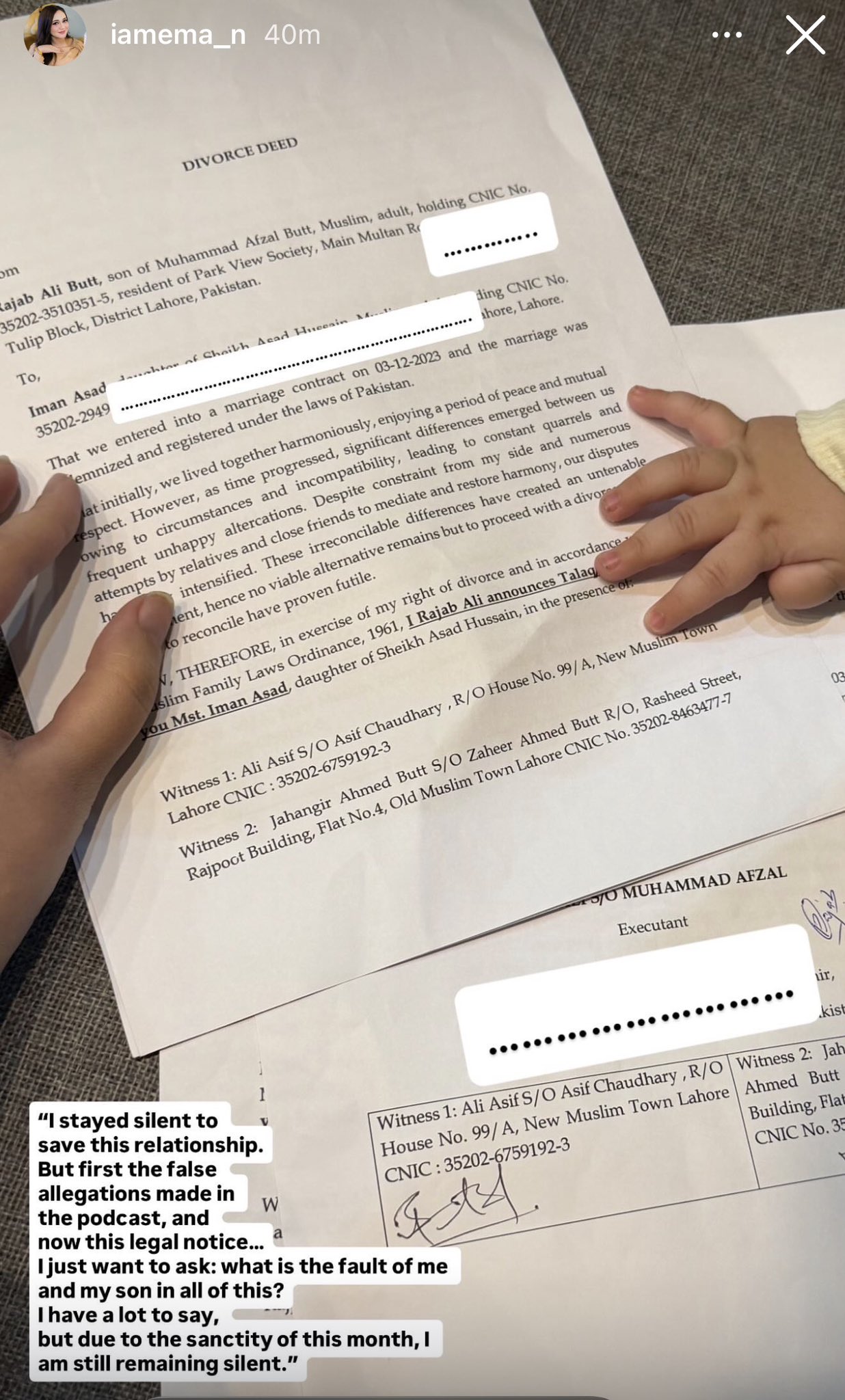 ایمان فاطمہ نے قانونی نوٹس کی تصویر شیئر کرتے ہوئے لکھا کہ میں اس رشتے کو بچانے کے لیے خاموش رہی لیکن پہلے پوڈکاسٹ میں لگائے گئے جھوٹے الزامات، اور اب یہ قانونی نوٹس بھیج دیا گیا ہے۔