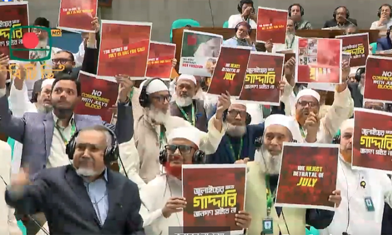 اسپیکر حافظ الدین احمد کی جانب سے صدر محمد شہاب الدین کو جاتیہ سنگساد بھبن میں ایوان سے خطاب کی دعوت دینے کے بعد جماعتِ اسلامی اور نیشنل سٹیزن پارٹی (این سی پی) کے ارکان احتجاجاً کھڑے ہو گئے۔