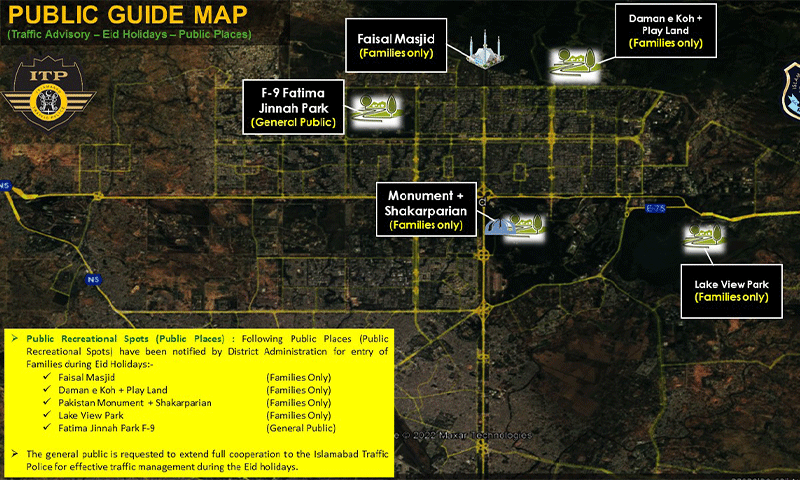 اسلام آباد پولیس نے عیدالفطر کے 3 دنوں کے لیے ٹریفک ایڈوائزری جاری کی ہے۔ لیک ویو پارک، دامن کوہ، اور شکرپڑیاں، مانومنٹ کو صرف فیملیز پارک قرار دیا گیا ہے، جبکہ ان پارکوں میں فیملیز کے علاوہ گاڑیوں اور موٹر سائیکلوں کے داخلے پر پابندی ہوگی۔