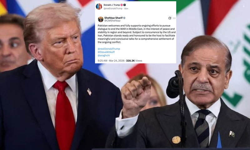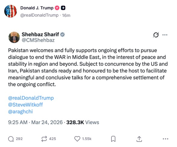 امریکی صدر ڈونلڈ ٹرمپ نے اپنے سوشل میڈیا پلیٹ فارم ٹروتھ سوشل پر وزیراعظم شہباز شریف کا بیان شیئر کیا جس میں انہوں نے مشرق وسطیٰ میں کشیدگی ختم کرنے کے لیے مذاکرات کی میزبانی کی پیشکش کی۔