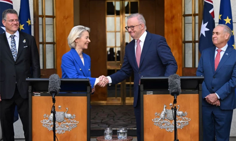 یورپی یونین اور آسٹریلیا نے طویل مذاکرات کے بعد منگل کو ایک آزاد تجارتی معاہدے پر دستخط کیے، جس کے تحت دونوں جانب تجارتی روابط مضبوط ہوں گے اور دفاعی تعاون کے مواقع بڑھیں گے۔