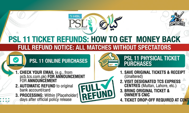 پاکستان کرکٹ بورڈ (پی سی بی) نے ایچ بی ایل پاکستان سپر لیگ 11 کے ٹکٹ ہولڈرز کے لیے ریفنڈ پالیسی کا اعلان کردیا ہے۔