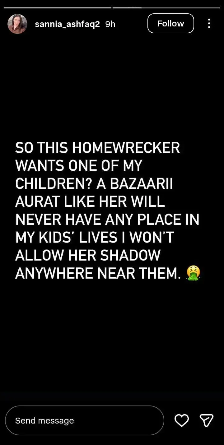 ثانیہ اشفاق نے انسٹاگرام پر اپنے بیان میں الزام لگایا کہ عماد وسیم کی موجودہ اہلیہ نائلہ راجہ ان کے بچوں میں سے ایک کو اپنے پاس رکھنا چاہتی ہیں۔انہوں نے کہا کہ وہ ایسی خاتون کو اپنے بچوں کی زندگی میں شامل نہیں ہونے دیں گی اور اس کا سایہ بھی بچوں پر پڑنے نہیں دیں گی۔
