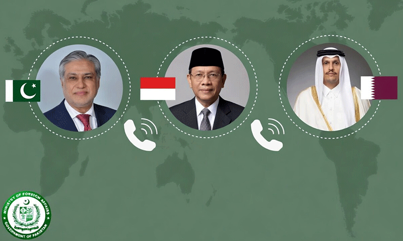 پاکستان کے ڈپٹی وزیر اعظم اور وزیر خارجہ سینٹر محمد اسحاق ڈار نے قطر اور انڈونیشیا کے وزرائے خارجہ کے ساتھ فون پر بات چیت کی، جس میں علاقائی اور عالمی صورتحال، دوطرفہ تعلقات اور امن و استحکام کے فروغ پر تبادلہ خیال کیا گیا۔