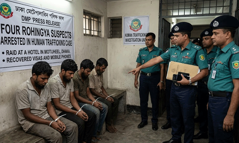 بنگلہ دیش کے دارالحکومت ڈھاکہ میں پولیس نے انسانی اسمگلنگ کے ایک مبینہ نیٹ ورک کے خلاف کارروائی کرتے ہوئے چار روہنگیا افراد کو گرفتار کر لیا۔ ملزمان کو خفیہ اطلاع پر کیے گئے چھاپے کے دوران حراست میں لیا گیا۔