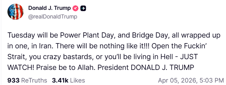 اپنے سوشل میڈیا پلیٹ فارم ٹروتھ سوشل پر ایک بیان میں انہوں نے کہاکہ منگل کو ایران میں بجلی گھروں اور پلوں پر حملوں کا دن ہوگا، ایران میں ایک ساتھ یہ کام مکمل کیا جائےگا۔