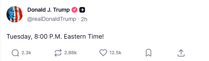 امریکی صدر ڈونلڈ ٹرمپ نے ایران کو معاہدے کے لیے دی گئی مہلت کا حتمی وقت واضح کرتے ہوئے سوشل میڈیا پر بتایا کہ ڈیڈ لائن منگل کو رات 8 بجے (ایسٹرن ٹائم) ختم ہوگی۔