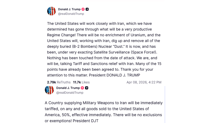 امریکی صدر نے کہا کہ ایران کے ساتھ محصولات اور پابندیوں کے معاملات پر بات چیت جاری ہے اور جو ممالک ایران کو فوجی ہتھیار فراہم کریں گے، ان پر فوری طور پر 50 فیصد ٹیرف عائد کیا جائے گا۔ ان ٹیرفز کا اطلاق امریکا کو فروخت کی جانے والی تمام اشیا پر ہوگا اور کسی قسم کی رعایت یا استثنا شامل نہیں ہوگا۔