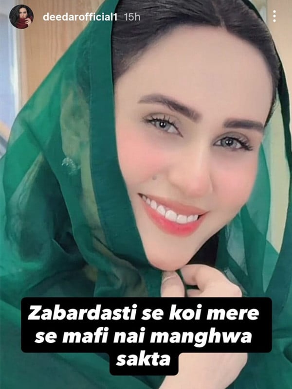 عظمیٰ بخاری کے بیان کو ریشم نے سراہتے ہوئے شیئر کیا اور انہیں ایک اچھی دوست قرار دیا۔ دوسری جانب دیدار نے اس پر ردعمل دیتے ہوئے واضح کیا کہ وہ کسی دباؤ میں آ کر معافی نہیں مانگیں گی اور انہیں کوئی زبردستی اس بات پر مجبور نہیں کر سکتا۔
