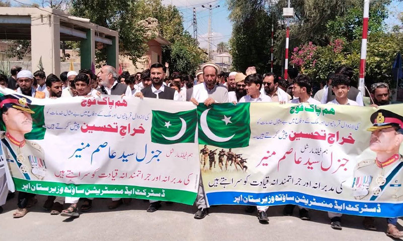 جنوبی وزیرستان میں ضلعی انتظامیہ کی جانب سے پاک فوج کے حق میں ریلیاں نکالی گئیں، جن میں بڑی تعداد میں قبائلی عمائدین، نوجوانوں اور طلبا نے شرکت کی۔ شرکا نے فیلڈ مارشل سید عاصم منیر کی قیادت پر اعتماد کا اظہار کرتے ہوئے عالمی امن کے لیے ان کے کردار کو سراہا۔