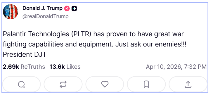 سوشل میڈیا جاری اپنے مختصر بیان میں انہوں نے کہاکہ پلانٹیر ٹیکنالوجیز نے جنگی کارروائیوں میں اپنی مضبوط صلاحیتوں کو ثابت کردیا۔