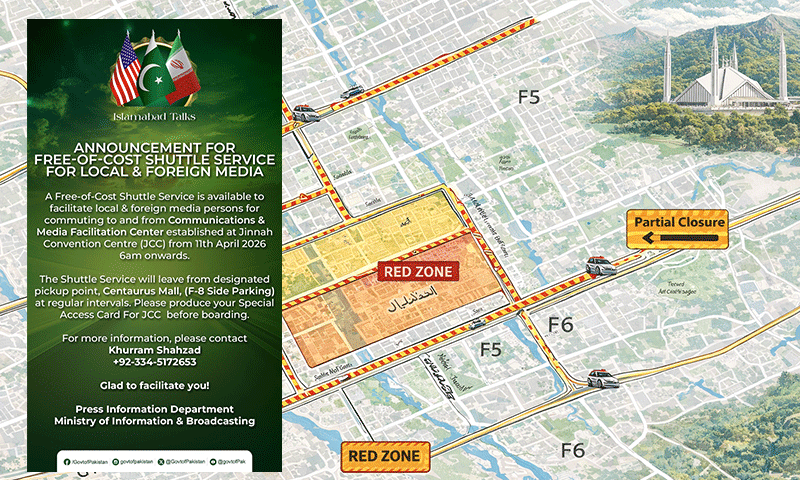 سرکاری اعلامیے کے مطابق یہ شٹل سروس 11 اپریل 2026 سے صبح 6 بجے سے دستیاب ہوگی، جو جناح کنونشن سینٹر میں قائم میڈیا فیسلیٹیشن سینٹر تک صحافیوں کو لے کر جائے گی۔ شٹل سروس مقررہ وقفوں سے سینٹورس مال (ایف-8 سائیڈ پارکنگ) سے روانہ ہوگی۔
