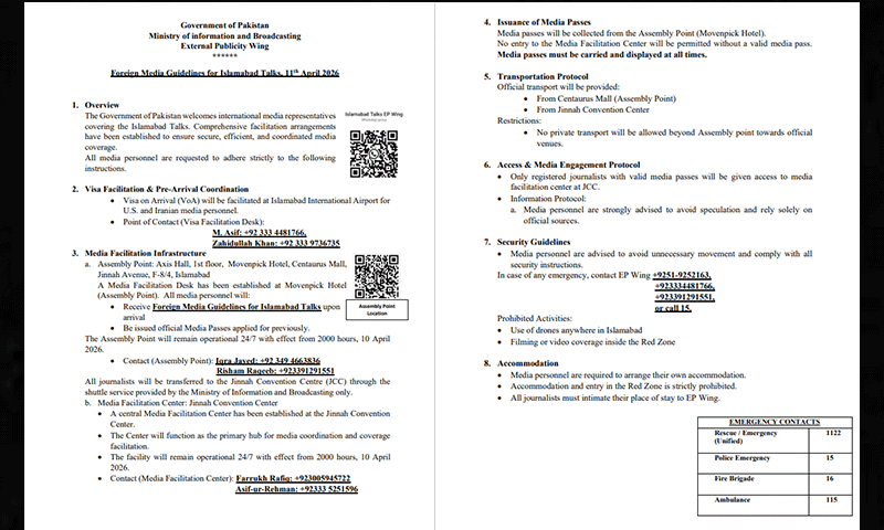 حکومتِ پاکستان نے اسلام آباد میں ہونے والے اہم مذاکرات کی کوریج کے لیے آنے والے بین الاقوامی میڈیا نمائندگان کے لیے باضابطہ گائیڈ لائنز جاری کر دی ہیں۔ وزرات اطلاعات کے مطابق امریکی اور ایرانی صحافیوں کو اسلام آباد انٹرنیشنل ایئرپورٹ پر ویزا آن آرائیول کی سہولت حاصل ہوگی، جبکہ میڈیا کی نقل و حرکت، سیکیورٹی اور کوریج پر سخت ضابطے نافذ کیے گئے ہیں۔