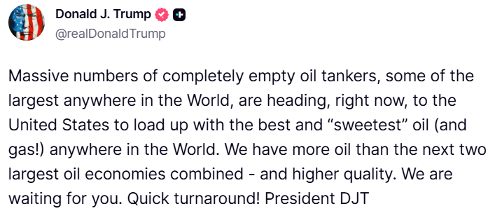 امریکی صدر ڈونلڈ ٹرمپ نے کہا ہے کہ دنیا بھر سے خالی آئل ٹینکرز بڑی تعداد میں امریکا کا رخ کر رہے ہیں تاکہ یہاں سے عالمی معیار کا تیل اور گیس حاصل کر سکیں۔