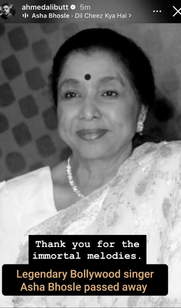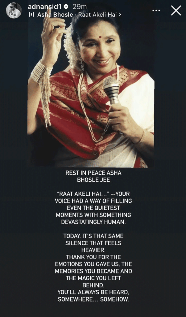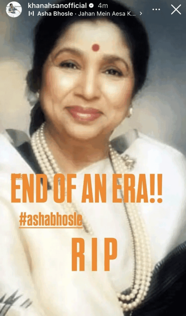 ادھر آشا بھوسلے کے انتقال پر اظہارِ افسوس کا سلسلہ تاحال جاری ہے اور جیسے جیسے لوگ اس خبر سے آگاہ ہو رہے ہیں، مزید تعزیتی پیغامات سامنے آ رہے ہیں۔