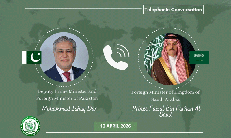 نائب وزیراعظم و وزیر خارجہ سینیٹر محمد اسحاق ڈار نے سعودی عرب کے وزیر خارجہ شہزادہ فیصل بن فرحان سے ٹیلیفونک رابطہ کیا، دونوں رہنماؤں نے خطے کی صورتحال اور اسلام آباد میں ہونے والے حالیہ مذاکرات میں ہونے والی پیش رفت پر تفصیلی تبادلہ خیال کیا۔