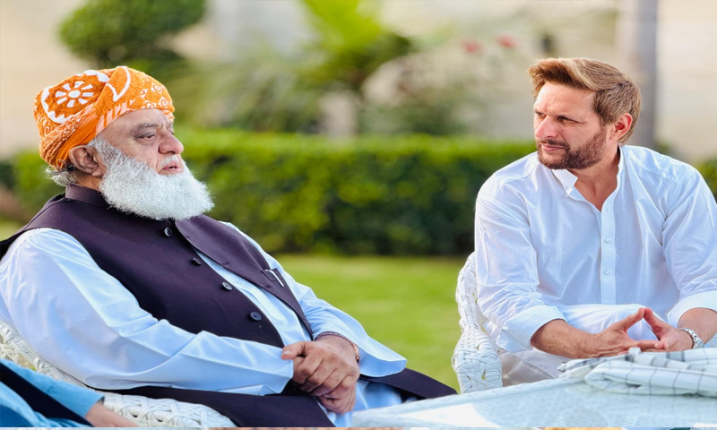 جمعیت علمائے اسلام کے سربراہ مولانا فضل الرحمان کی شاہد آفریدی کی رہائش گاہ آمد ہوئی جہاں دونوں شخصیات کے درمیان مختلف معاملات پر تبادلہ خیال کیا گیا اور مہمان نے میزبان کے فلاحی کاموں کی تعریف بھی کی۔