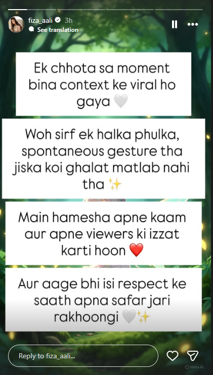 انہوں نے انسٹاگرام پر وضاحت دیتے ہوئے کہا کہ سوشل میڈیا پر ایک مختصر سا لمحہ بغیر کسی سیاق و سباق کے وائرل کیا گیا، جبکہ یہ محض ایک ہلکا پھلکا اور بے ساختہ اشارہ تھا جس کا کوئی منفی مطلب نہیں لیا جانا چاہیے۔